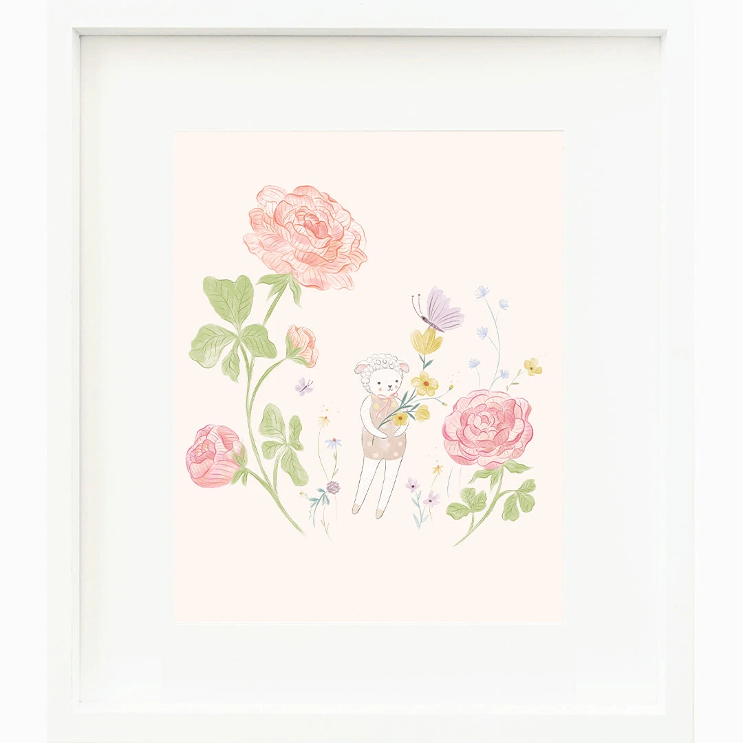 This stunning print features a breathtakingly hand painted watercolor rendition of Lucy gathering wildflowers with her butterfly friends. A beautiful addition to any stylish nursery!