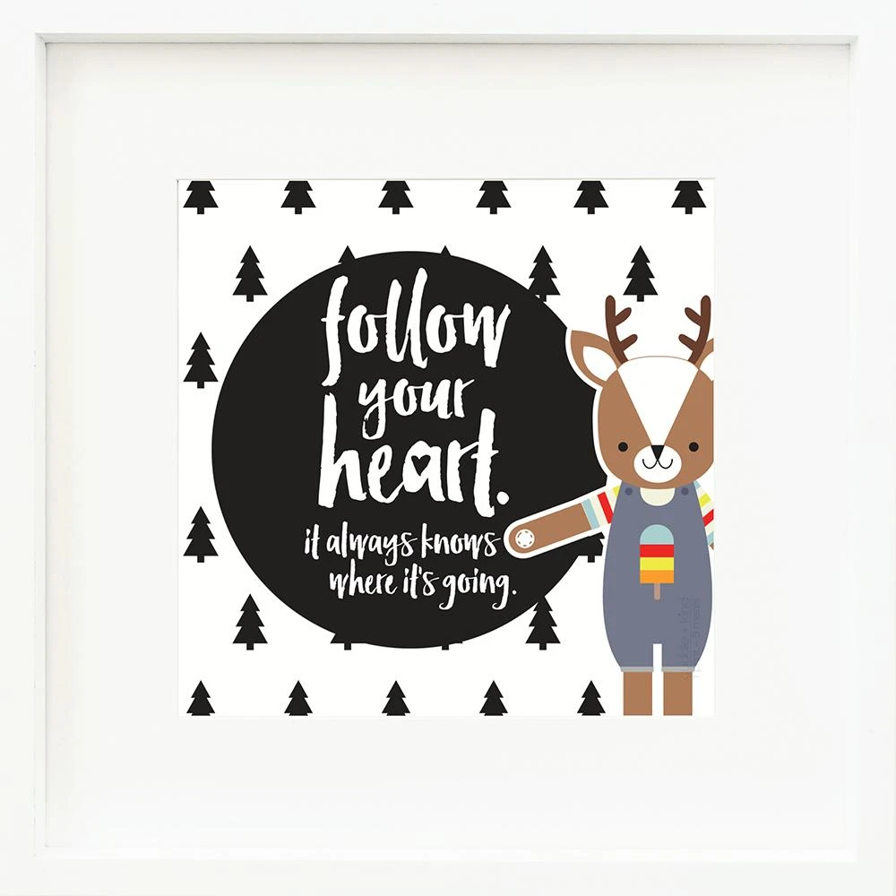 This is Scout the deer’s favorite quote. We love how the modern graphics of this print add a clean, trendy feel to any décor. Perfect for a monochrome room.