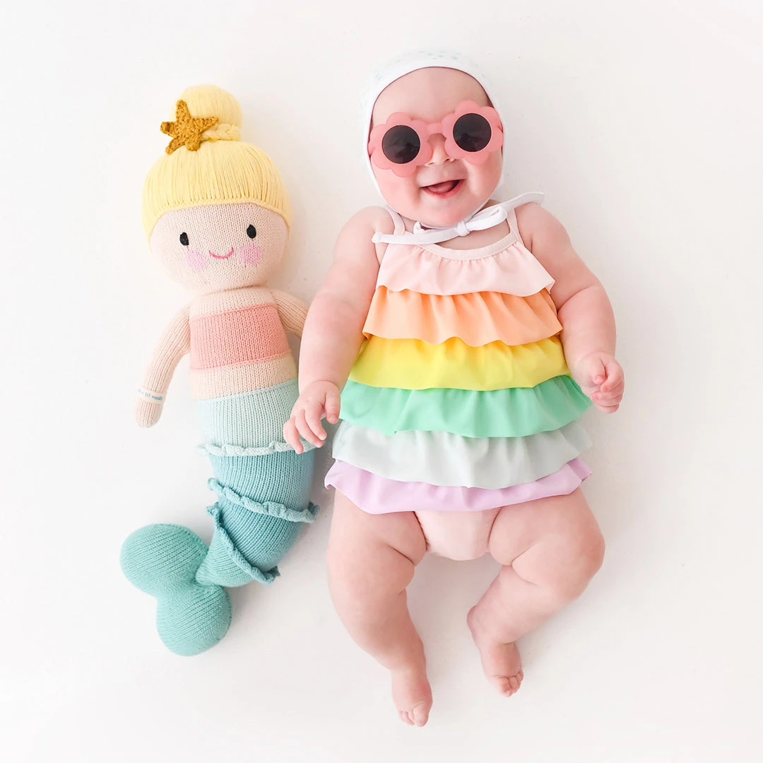 I spend my days frolicking with dolphins and floating on my back, gazing at the clouds. I’d love to share all my dreams with you, big and small. Let’s play together with my beautiful seashell collection, then search for treasures at the bottom of the sea. Let’s be mermaids, you and me!