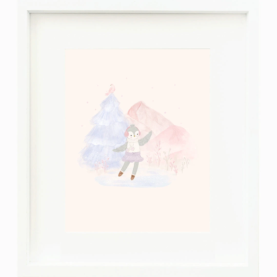 This stunning print features a breathtaking hand painted watercolor rendition of Skylar the penguin frolicking in a frosty scene. A beautiful addition to your stylish winter nursery decor!